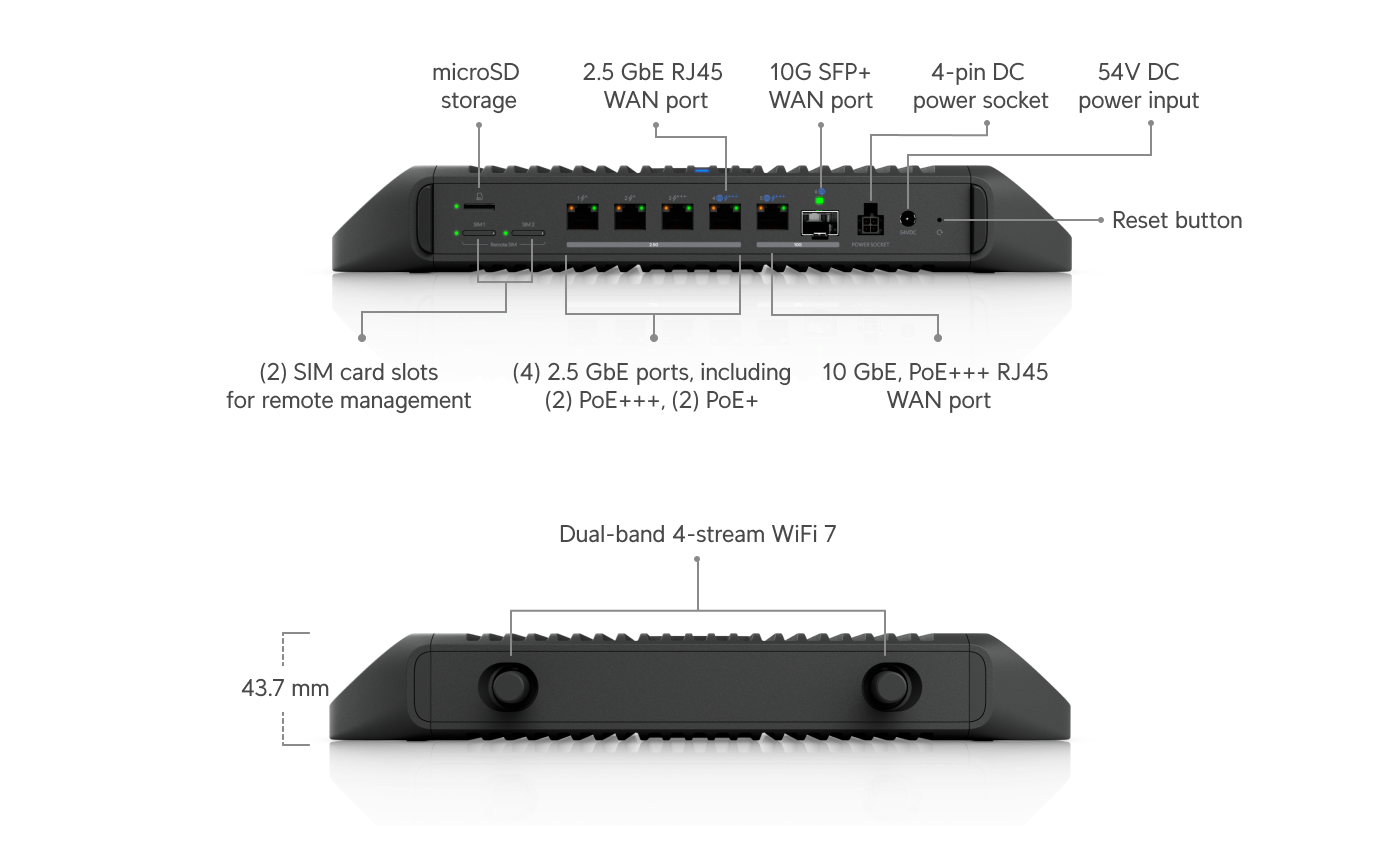 Powerful multi-WAN UniFi Cloud Gateway with remote SIM support*
