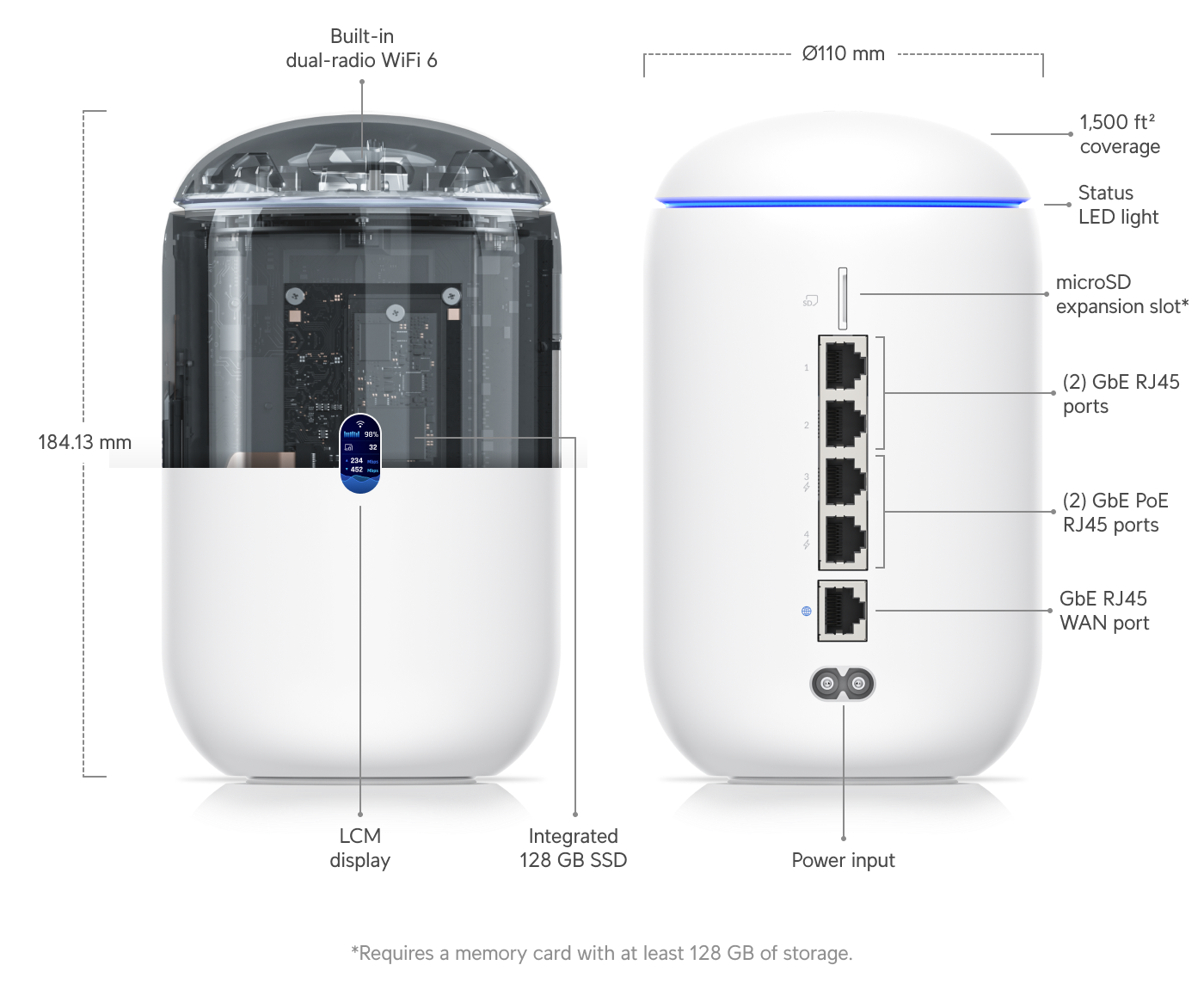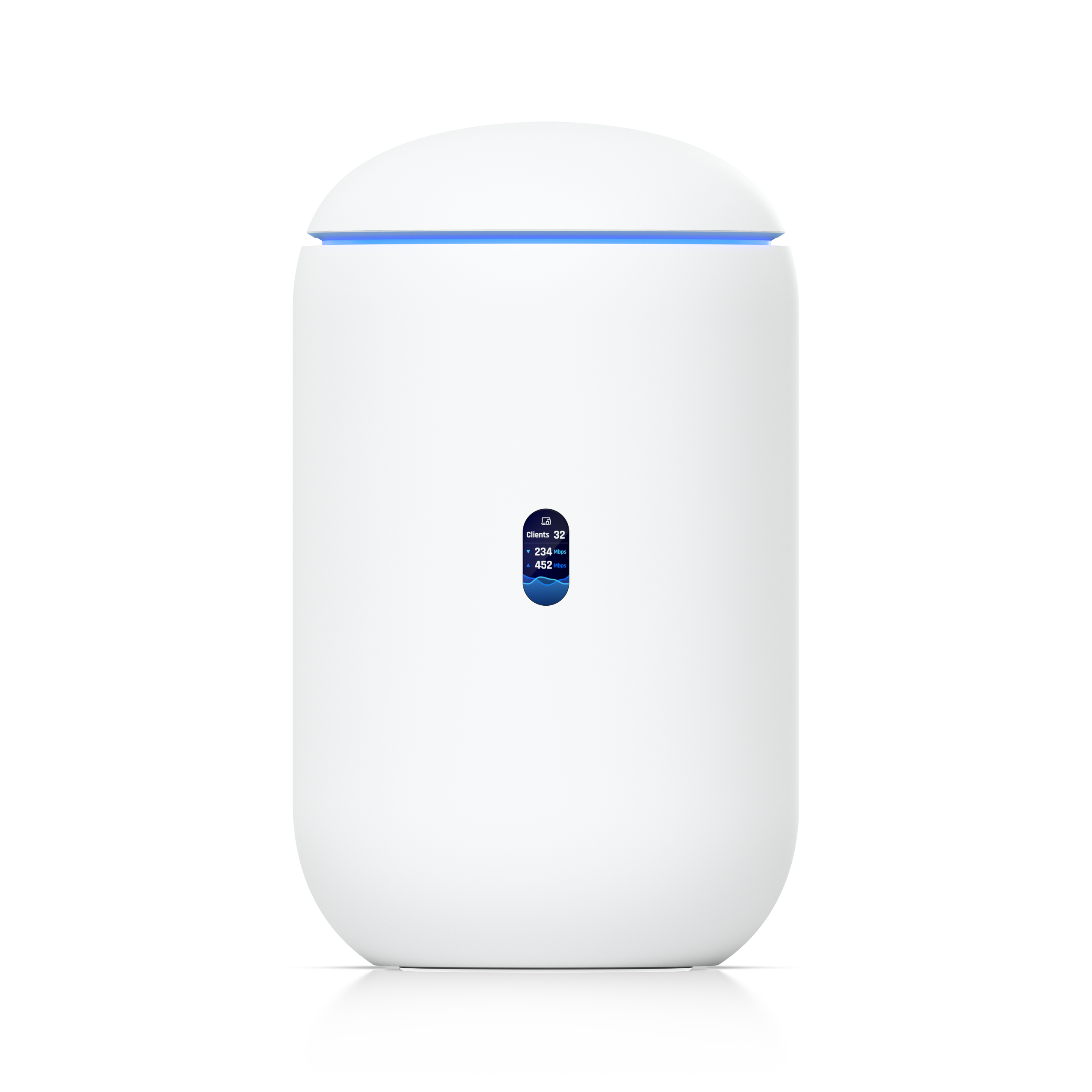 Desktop UniFi Cloud Gateway with integrated WiFi 6 and PoE switching.