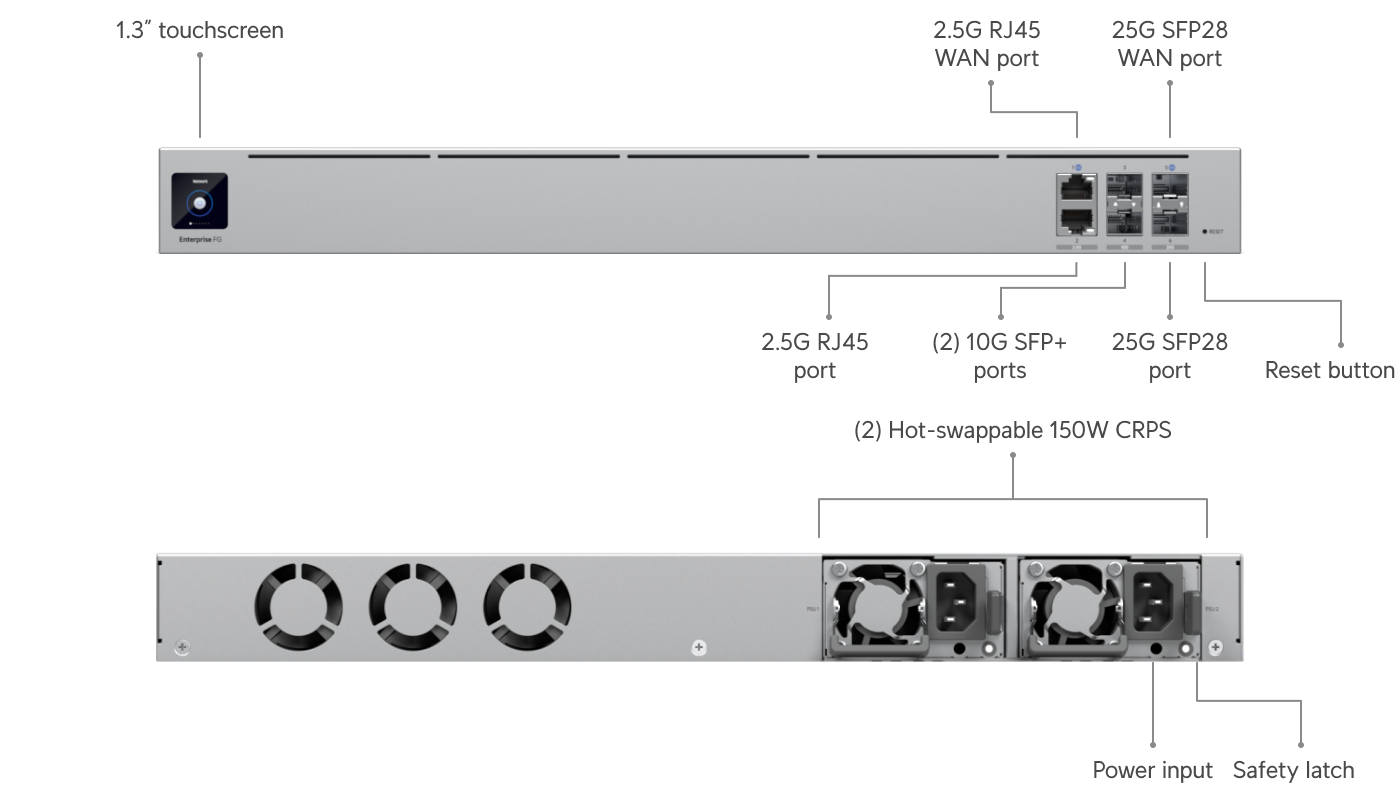 25G Cloud Gateway with 500+ UniFi device / 5,000+ client support, 12.5 Gbps IPS routing, and complete high availability.